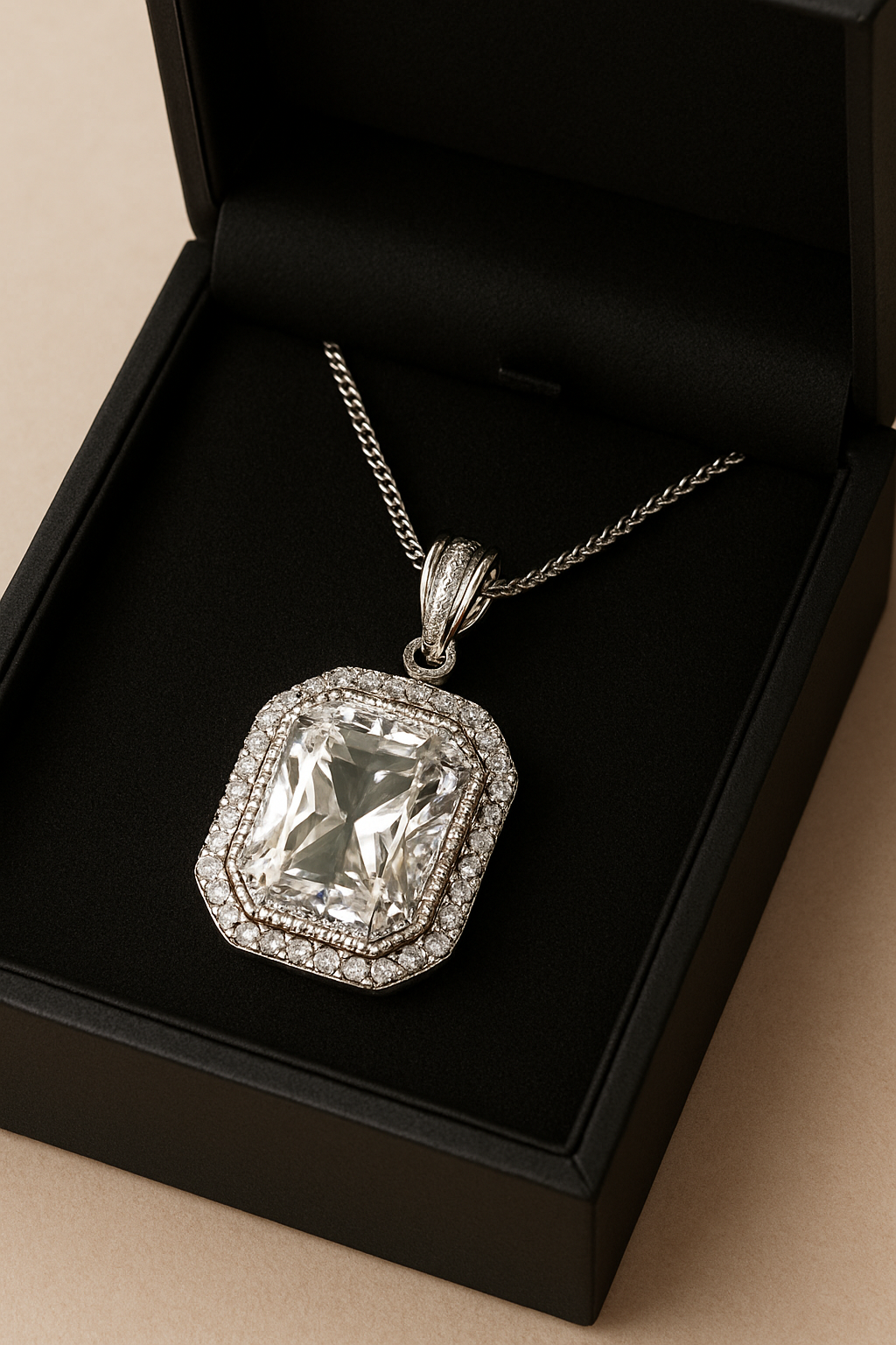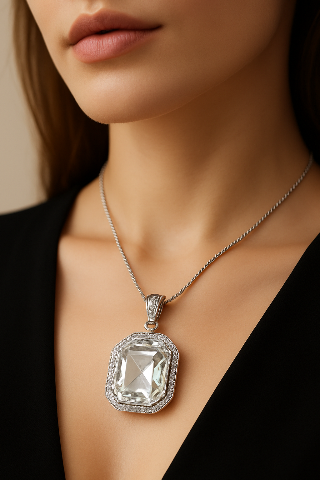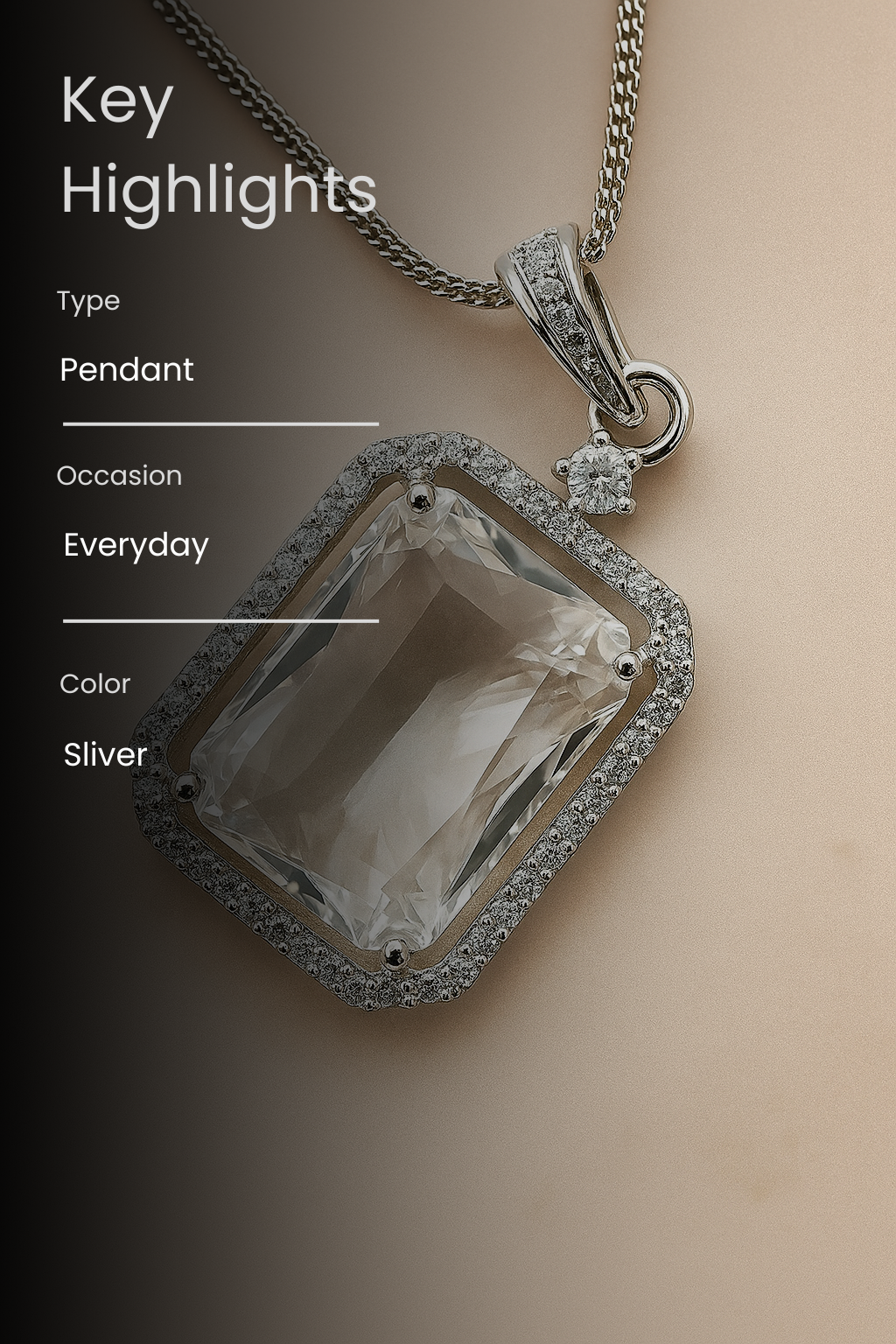 Shine with understated elegance in this  Solitaire Crystal Pendant , showcasing a large emerald-cut stone framed by dazzling micro-crystals on a sleek silver chain.