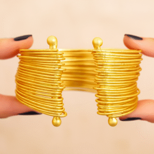 Add a touch of regal charm to your ensemble with the Regal Stone Trio Gold Statement Bracelet — a striking blend of traditional artistry and contemporary elegance. This finely crafted piece showcases a textured gold medallion set with a large, glossy green stone at the center. Flanking the medallion on each side are two faceted ruby-toned cabochons, all set against three sleek golden bands that wrap gracefully around the wrist. Perfect for festive wear, cultural occasions, or making a sophisticated everyday style statement, this bracelet adds richness and depth to any outfit.
