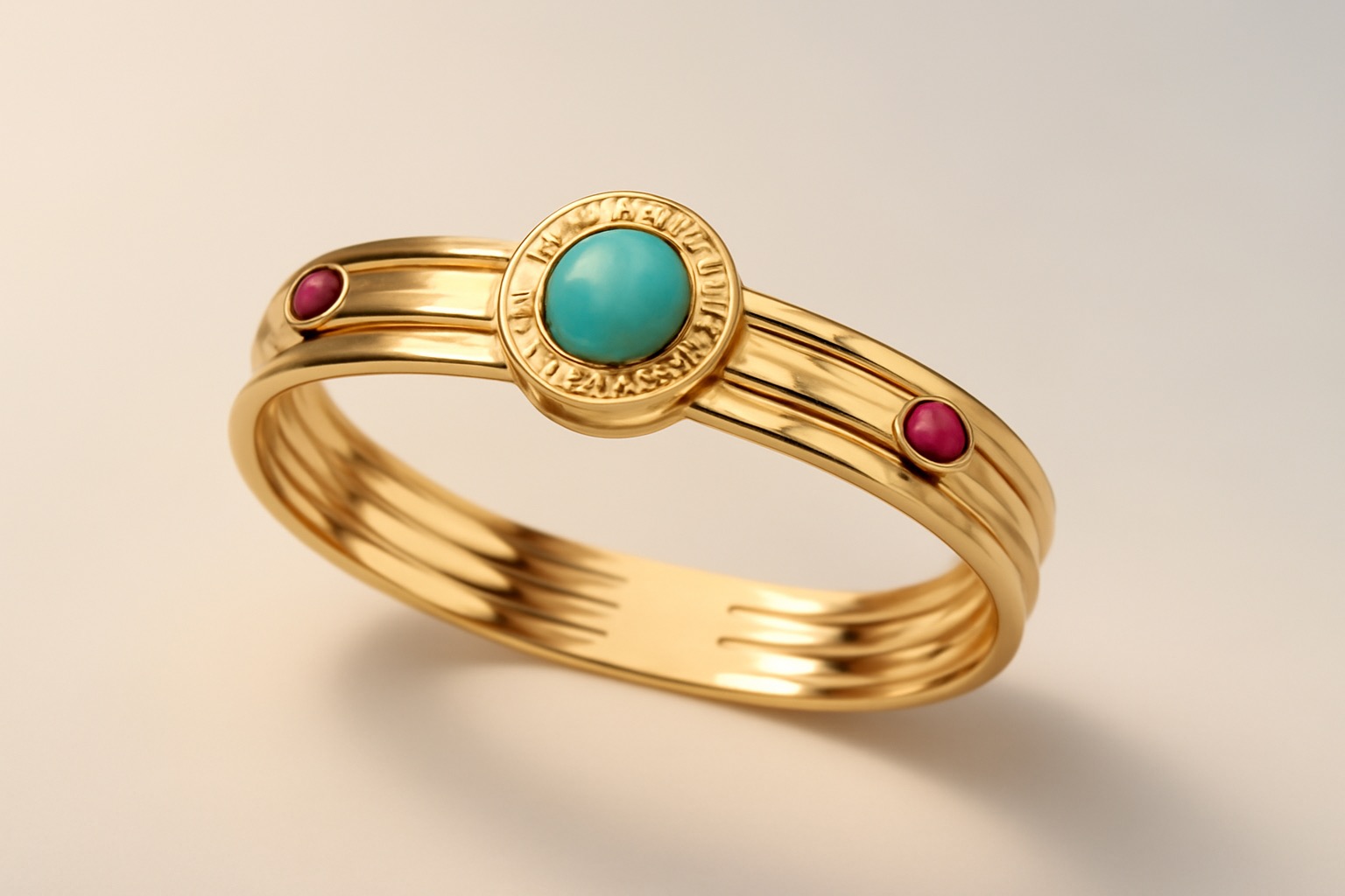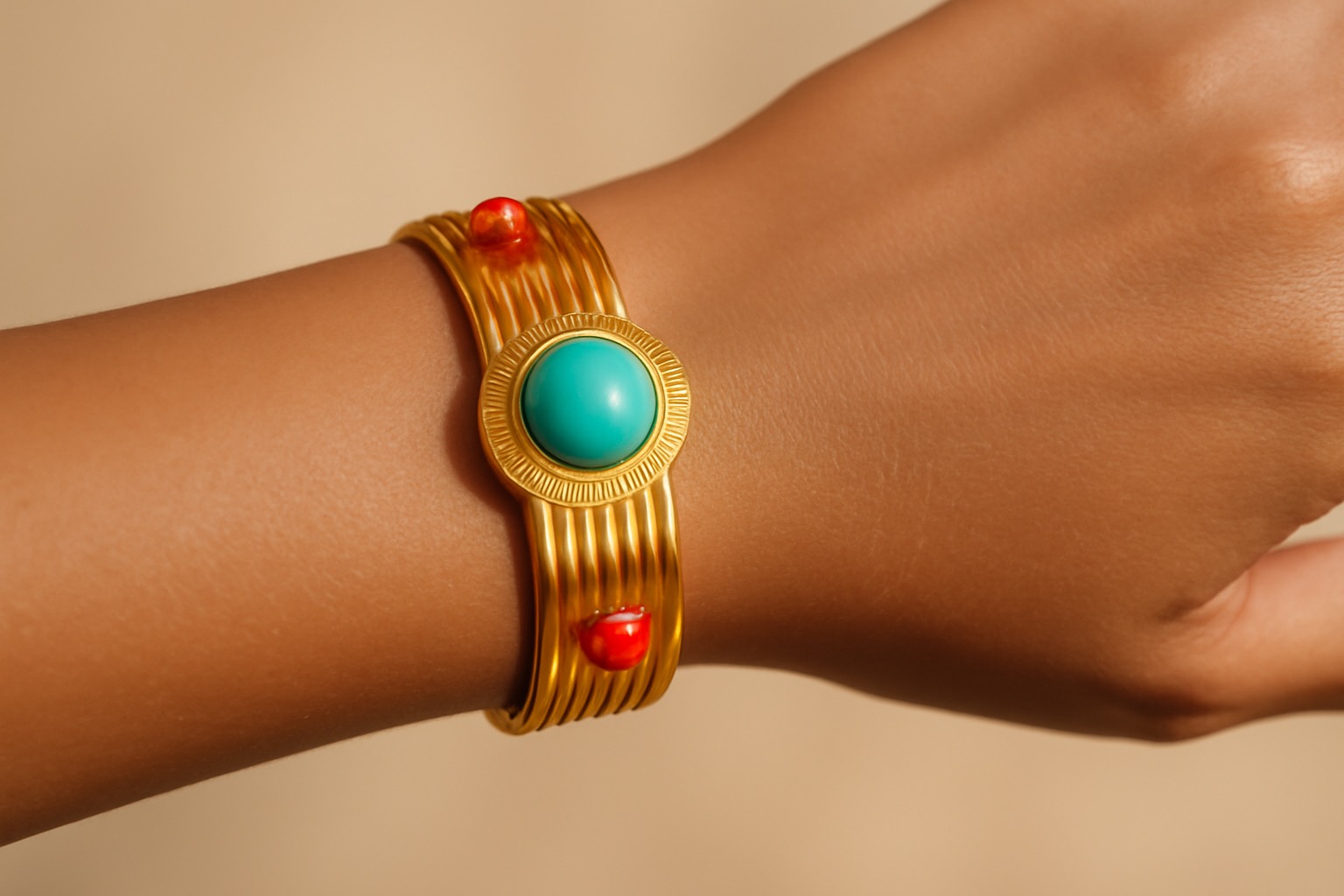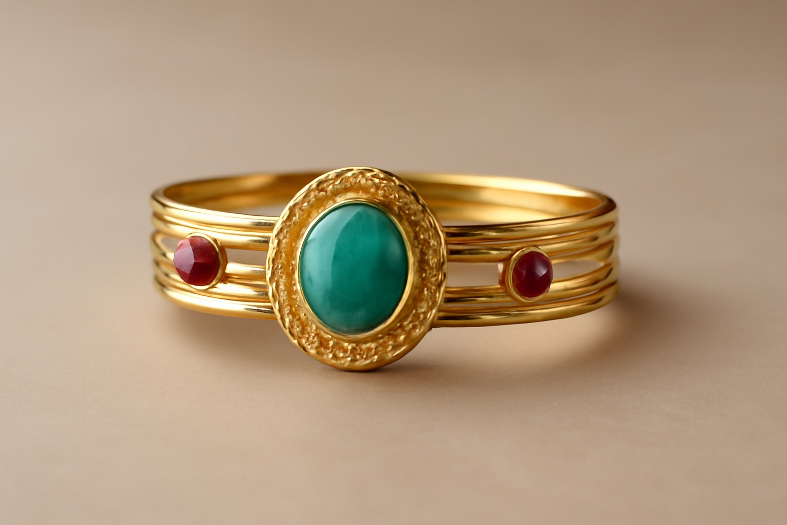 A luxurious gold bracelet featuring a bold green center stone flanked by deep ruby-red accents, exuding vintage royalty and modern finesse.