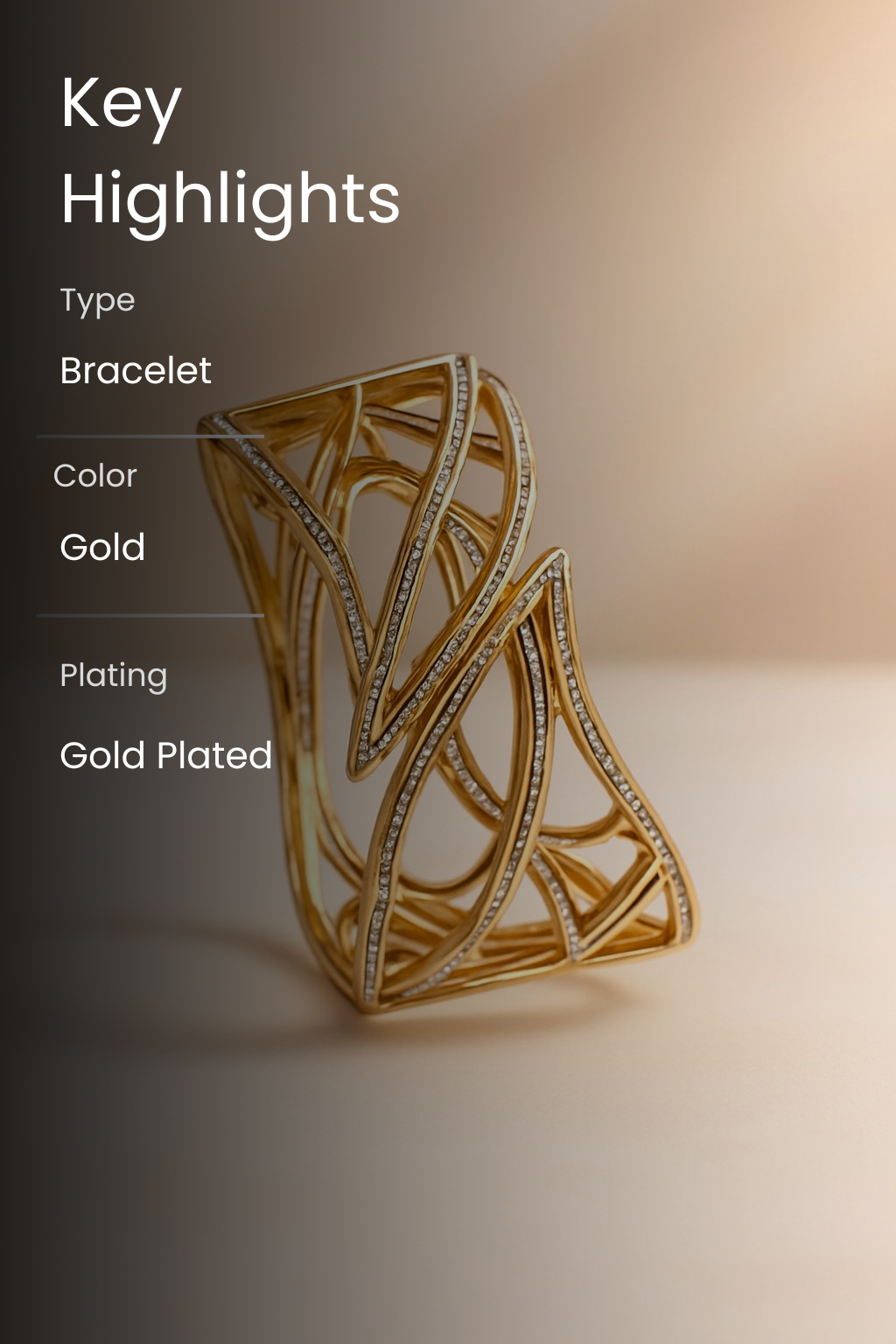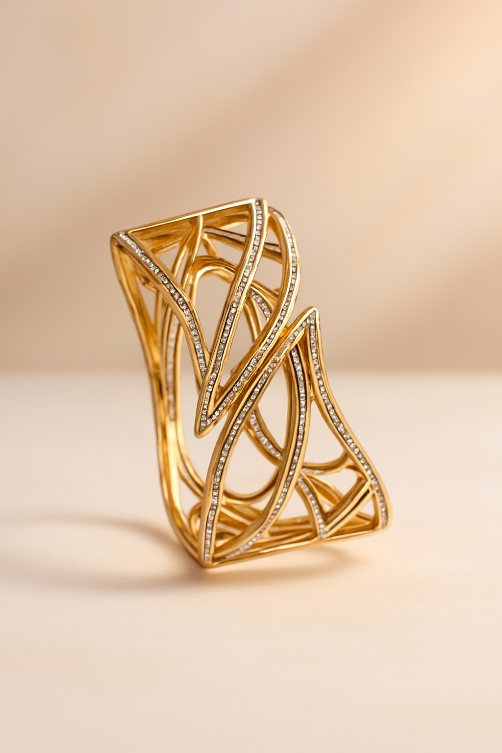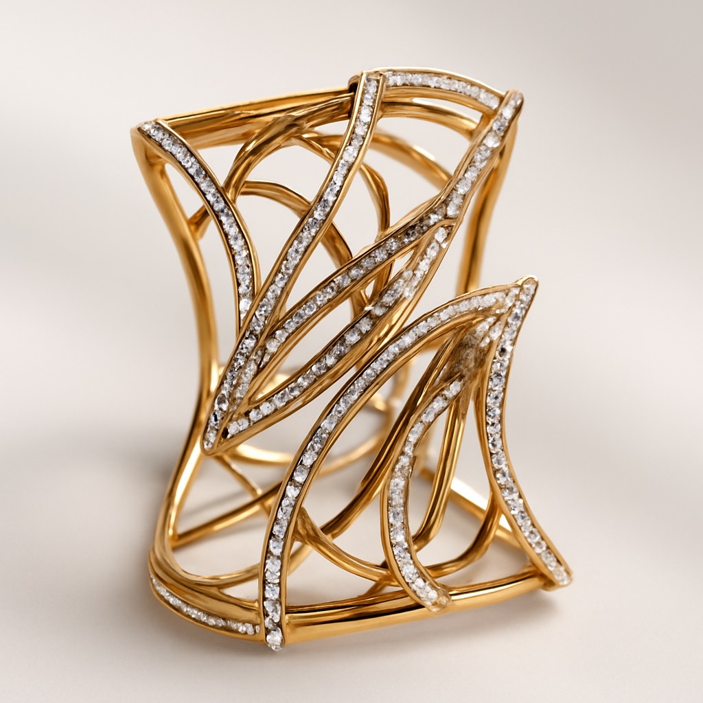 Type: Imitation Jewellery (Non-Precious) Material: High-quality metal alloy with gold-plated polish Stones: Micro pavé synthetic CZ stones Design: Sculptural abstract curves with layered, openwork geometry Finish: Glossy, mirror-shine polish with anti-tarnish protection Closure: Open cuff style (non-adjustable rigid fit)